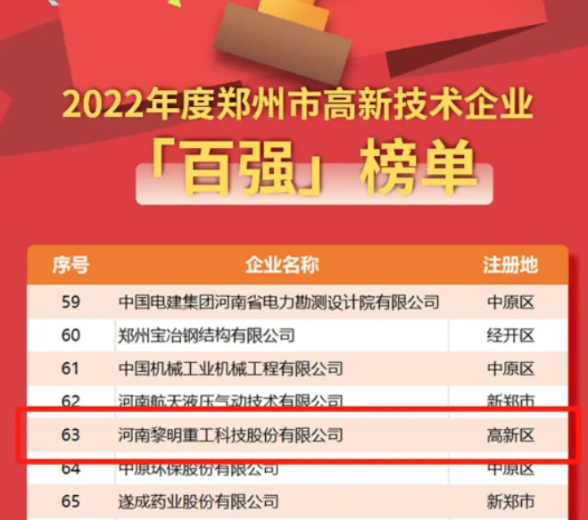 近日,黎明重工再創(chuàng)佳績,鄭州市科學技術(shù)情報研究所公布了2022年度鄭州市高新技術(shù)企業(yè)“雙百”榜單,黎明重工憑借過硬的企業(yè)實力成功入選。